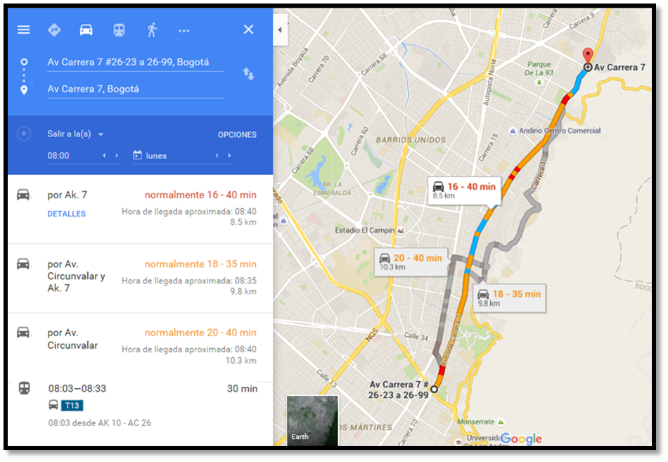 hora pico (8:00 am) de un día común y corriente un carro particular tarda hasta