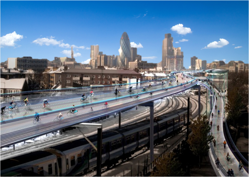 de súper biciautopistas construyendo una red de biciautopistas en el cielo[3] de 219 kilómetros que iría en un viaducto