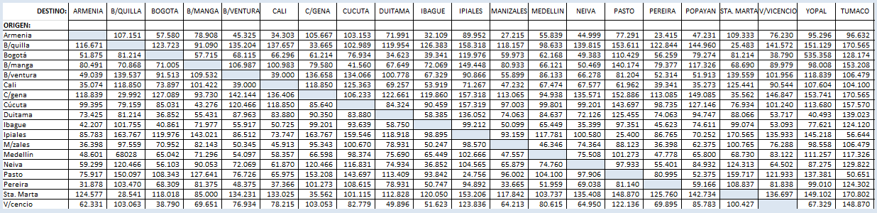 filas el origen y en las columnas el destino de la carga. En cada una de las